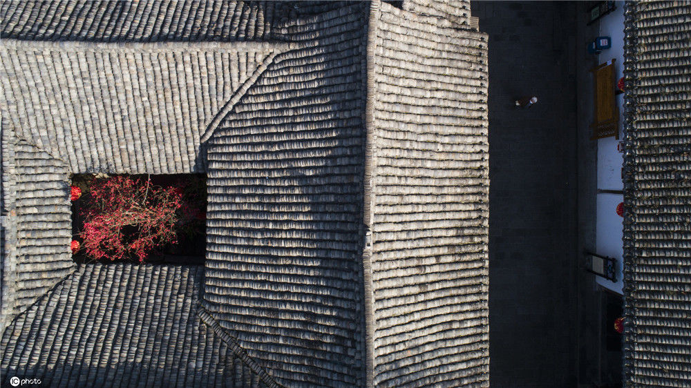 2020年2月21日,四川南充閬中古城中天樓旁,張家小院天井中的海棠在陽光中綻放(無人機(jī)拍攝)。