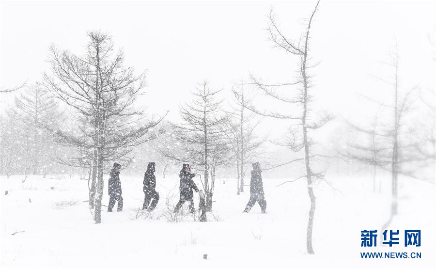 吉林省琿春森林公安局敬信派出所民警在風(fēng)雪中進行巡護作業(yè)(3月4日攝)。