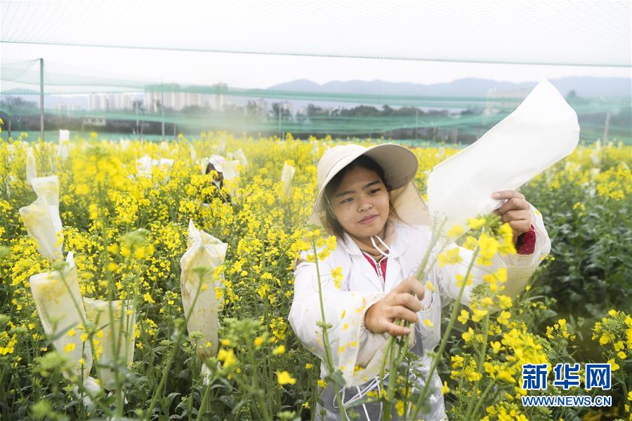 3月5日,工人在重慶市油菜工程技術(shù)研究中心油菜試驗(yàn)田內(nèi)給油菜花套袋。時(shí)下正值油菜花期,重慶市油菜工程技術(shù)研究中心的農(nóng)學(xué)專(zhuān)家?guī)ьI(lǐng)學(xué)生和技術(shù)工人搶抓農(nóng)時(shí),推進(jìn)油菜科研和育種工作。新華社記者 王全超 攝