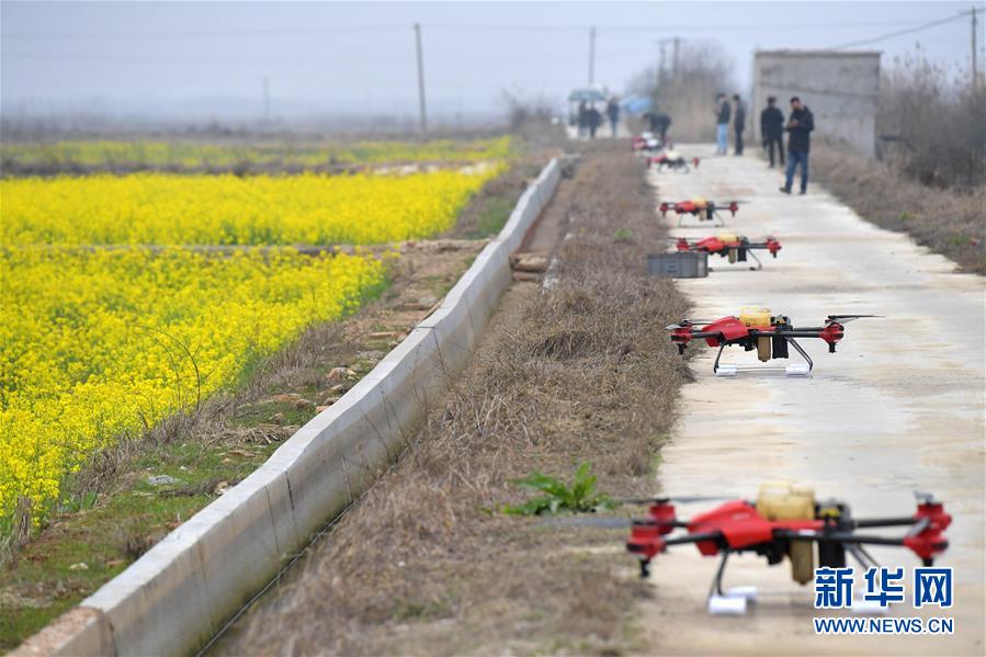 在江西省南昌市南昌縣蔣巷鎮(zhèn),無人機(jī)準(zhǔn)備起飛對(duì)油菜田進(jìn)行植保作業(yè)(2月28日攝)。新華社記者 彭昭之 攝