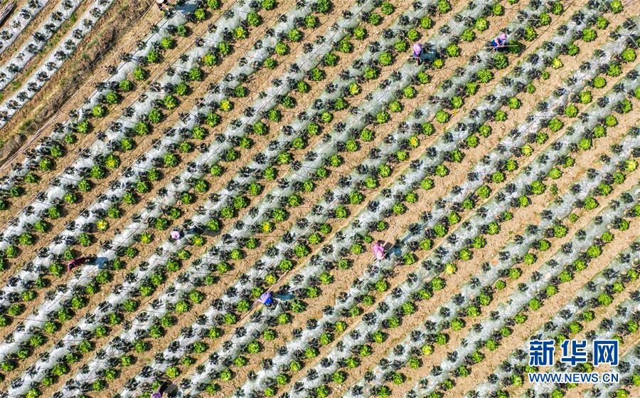 3月8日,貴州省羅甸縣龍坪鎮(zhèn)羅化村村民在田地里勞作(無人機照片)。