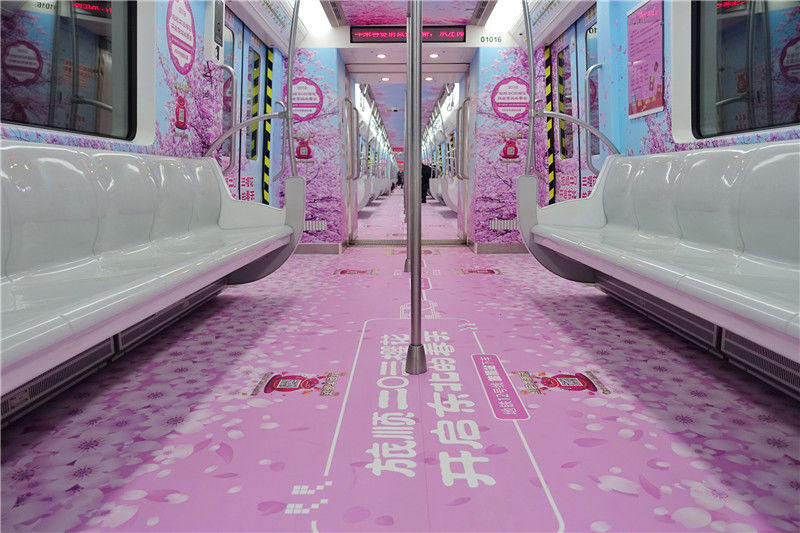 2018年4月3日,遼寧大連,伴隨濃濃春意,大連地鐵1號(hào)線、2號(hào)線、3號(hào)線、12號(hào)線櫻花專(zhuān)列同步上線,其中1號(hào)線為全景包列。櫻花專(zhuān)列車(chē)廂以粉色櫻花為基調(diào),沿枝椏延伸出的片片云霞,呈現(xiàn)春日花開(kāi)意境,傳遞出北國(guó)之春的韻律。南宮傲青/視覺(jué)中國(guó)