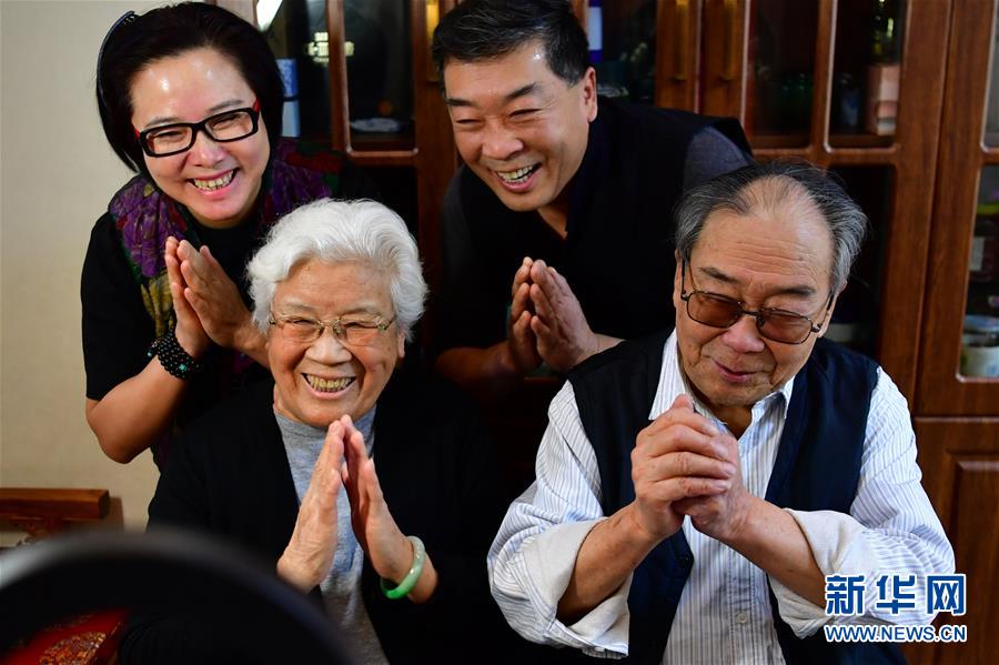 武凌云(右二)一家人在合演結(jié)束后向戲迷致謝(3月6日攝)。 新華社記者 曹陽 攝