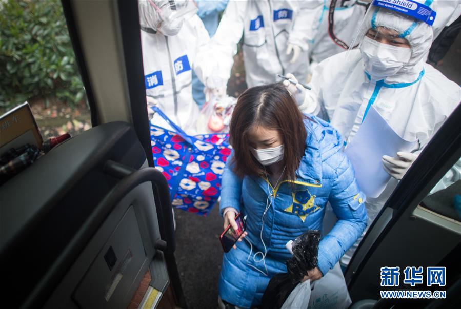 3月12日,黎婧(前)在志愿者的陪護(hù)下登上大巴。 3月12日,插畫(huà)師黎婧和84位病友離開(kāi)自己居住的武漢軟件工程職業(yè)學(xué)院康復(fù)驛站,回到自己家中。他們都是治愈出院的新冠病毒肺炎患者,已經(jīng)在武漢軟件工程職業(yè)學(xué)院康復(fù)驛站進(jìn)行了14天醫(yī)學(xué)觀察,達(dá)到醫(yī)學(xué)標(biāo)準(zhǔn),成功解除隔離。他們由專車(chē)運(yùn)送至所屬社區(qū)附近的集散點(diǎn)后,在社區(qū)工作人員的陪同下回家。 新華社記者 肖藝九 攝