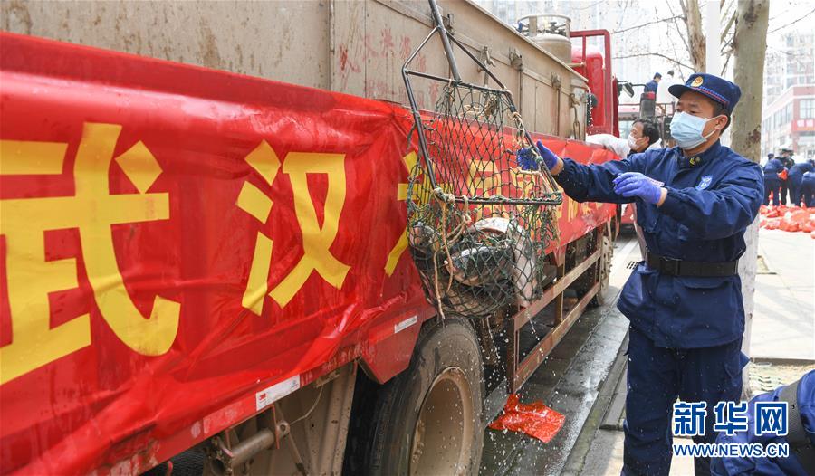 3月13日,一批運(yùn)到武漢市硚口區(qū)華生漢口城市廣場(chǎng)社區(qū)的活魚(yú)正在卸貨。當(dāng)日,首批100噸調(diào)配自湖北省咸寧市的活魚(yú)運(yùn)抵武漢市硚口區(qū)11個(gè)街道下轄社區(qū)。咸寧是魚(yú)米之鄉(xiāng),水產(chǎn)資源豐富。此次戰(zhàn)疫咸寧得到了全國(guó)人民的支持,疫情得到良好控制。咸寧送魚(yú),希望傳遞愛(ài)心,支持武漢早日戰(zhàn)勝疫情。新華社記者程敏攝