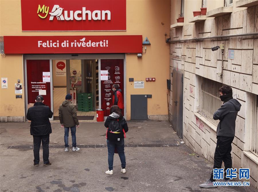 3月14日,在意大利首都羅馬,顧客排隊等待進(jìn)入超市。新華社記者劉詠秋攝