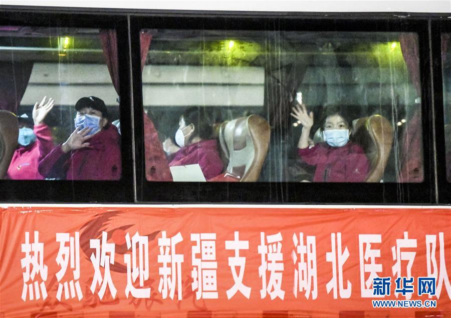 3月17日,在新疆烏魯木齊地窩堡國際機(jī)場,醫(yī)療隊隊員坐上大巴車準(zhǔn)備離開。新華社記者王菲攝