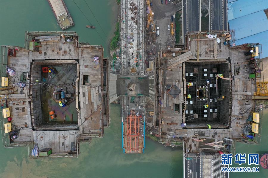 3月18日,施工人員在廣州南沙港鐵路跨西江斜拉橋東主塔進(jìn)行封頂施工(無人機(jī)照片)。新華社記者劉大偉攝