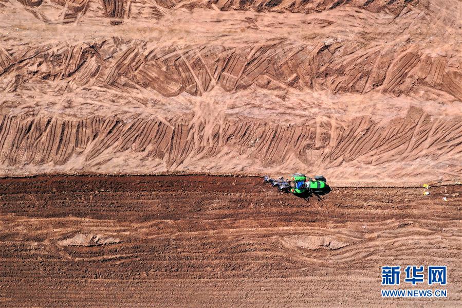 3月18日,在中國鐵路太原局集團有限公司新創(chuàng)云竹生態(tài)農(nóng)業(yè)園,農(nóng)民在用農(nóng)機犁地(無人機照片)。新華社記者 曹陽 攝