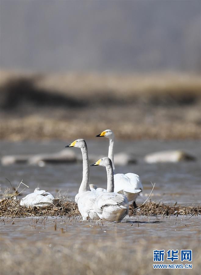 3月18日,候鳥(niǎo)在準(zhǔn)格爾旗大路鎮(zhèn)的黃河淺灘上棲息。 新華社記者 劉磊 攝