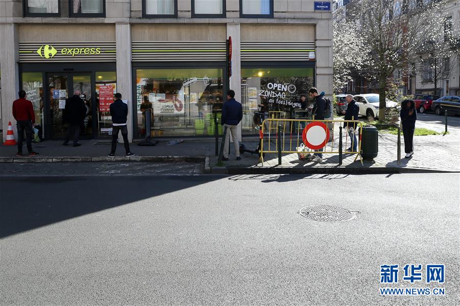 3月18日,在比利時(shí)布魯塞爾,顧客排隊(duì)等待進(jìn)入超市購(gòu)物。 新華社記者 張鋮 攝