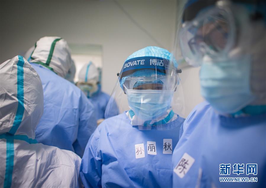 3月19日,在武漢市肺科醫(yī)院清潔區(qū),浙江醫(yī)療隊(duì)隊(duì)員孫麗秋(中)在穿戴防護(hù)服。  新華社記者 肖藝九 攝