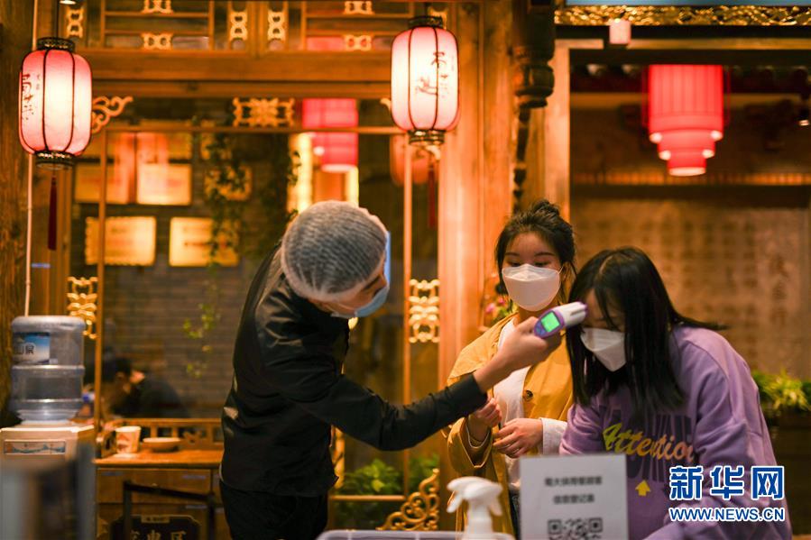 3月21日,在四川省成都市的一家火鍋店門口,顧客在登記信息,接受體溫檢測。近日,在做好新冠肺炎疫情防控措施的基礎上,四川省成都市的火鍋店逐漸恢復營業(yè)。新華社記者唐文豪攝