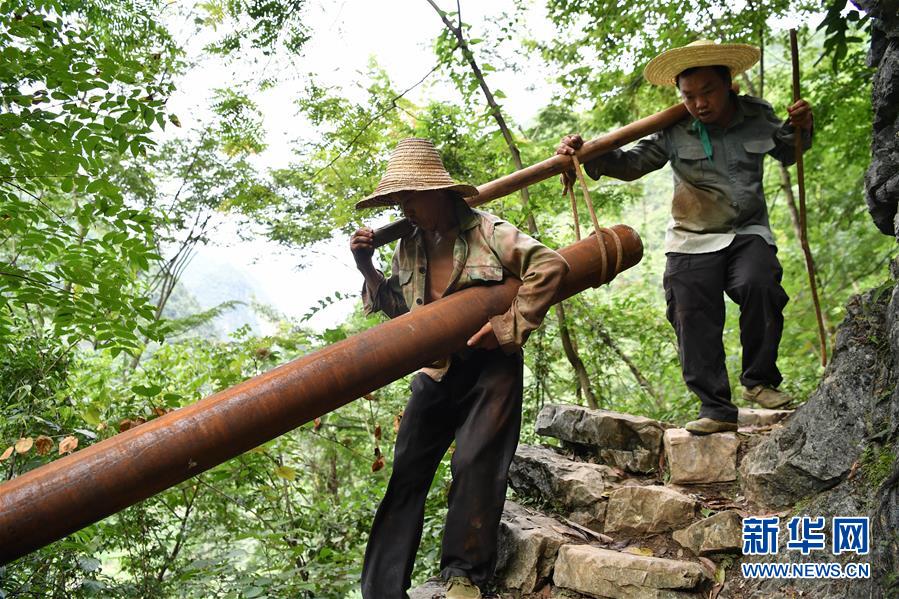 在廣西大化瑤族自治縣板升鄉(xiāng)弄雷村,工人們抬著抗旱飲水工程的水管在山路上前行(2016年8月10日攝)。廣西有近一半貧困人口生活在石漠化地區(qū),涉及數(shù)十個縣區(qū)。這里也是廣西飲水保障程度最低的地區(qū),解決貧困人口飲水問題是廣西脫貧攻堅戰(zhàn)“硬仗中的硬仗”?!笆濉币詠恚瑥V西加快實施農村飲水安全鞏固提升工程。因地制宜,采取新建、擴建及管網(wǎng)延伸等多種措施,補齊貧困地區(qū)水利薄弱短板,進一步提升石漠化地區(qū)群眾飲水安全保障水平,助推脫貧攻堅。新華社記者黃孝邦攝
