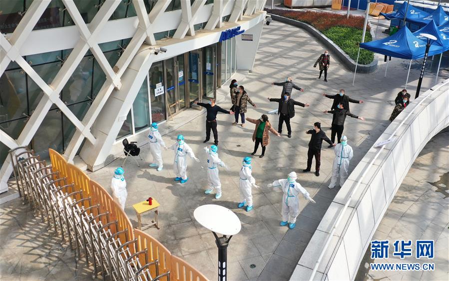3月10日,在武漢江夏方艙醫(yī)院,醫(yī)護人員教患者練習(xí)八段錦(無人機照片)。新華社記者才揚攝