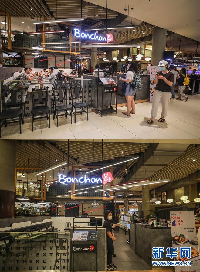 這是3月21日拍攝的泰國曼谷暹羅百麗宮商場負一層的美食城(上圖)和3月22日拍攝的美食城對比圖。商場除了負一層的美食城和超市外,全部關(guān)閉。美食城只對顧客提供外賣服務。新華社記者張可任攝