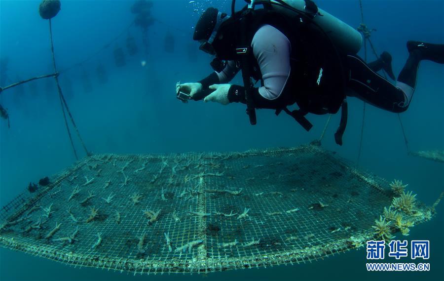 3月28日,在位于海南三亞蜈支洲島旅游區(qū)的海洋牧場,工作人員在清理附著在珊瑚上的漁網(wǎng)。近日,位于海南三亞蜈支洲島旅游區(qū)的海洋牧場復(fù)工,海底作業(yè)逐漸恢復(fù)正常,開始進(jìn)行人工魚礁吊裝擺位、水下監(jiān)控清理以及日常巡護(hù)等工作。據(jù)介紹,人工魚礁有利于魚類種類增加和數(shù)量提高,蜈支洲島海域海洋牧場人工魚礁表面附著珊瑚、貝類、藻類等生物種類達(dá)120余種。新華社記者楊冠宇攝