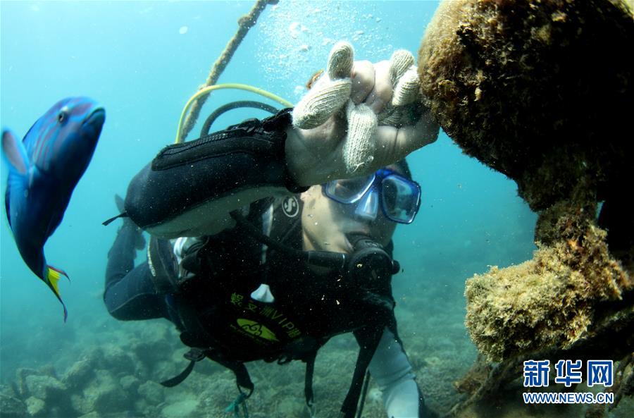 在位于海南三亞蜈支洲島旅游區(qū)的海洋牧場(chǎng),工作人員在清理監(jiān)控設(shè)備(3月27日攝)。近日,位于海南三亞蜈支洲島旅游區(qū)的海洋牧場(chǎng)復(fù)工,海底作業(yè)逐漸恢復(fù)正常,開始進(jìn)行人工魚礁吊裝擺位、水下監(jiān)控清理以及日常巡護(hù)等工作。據(jù)介紹,人工魚礁有利于魚類種類增加和數(shù)量提高,蜈支洲島海域海洋牧場(chǎng)人工魚礁表面附著珊瑚、貝類、藻類等生物種類達(dá)120余種。新華社記者楊冠宇攝