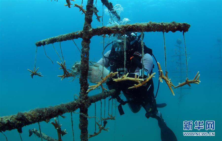 3月28日,在位于海南三亞蜈支洲島旅游區(qū)的海洋牧場,工作人員在清理附著在珊瑚上的漁網(wǎng)。近日,位于海南三亞蜈支洲島旅游區(qū)的海洋牧場復(fù)工,海底作業(yè)逐漸恢復(fù)正常,開始進行人工魚礁吊裝擺位、水下監(jiān)控清理以及日常巡護等工作。據(jù)介紹,人工魚礁有利于魚類種類增加和數(shù)量提高,蜈支洲島海域海洋牧場人工魚礁表面附著珊瑚、貝類、藻類等生物種類達120余種。新華社記者楊冠宇攝