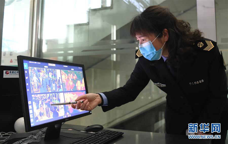 3月28日,工作人員在武漢站出站口監(jiān)看檢測(cè)體溫的儀器。新華社記者程敏攝