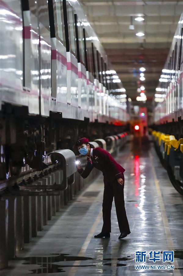 3月28日,武漢地鐵運(yùn)營有限公司司機(jī)吳亞在常青車輛段檢查車輛情況。新華社記者沈伯韓攝