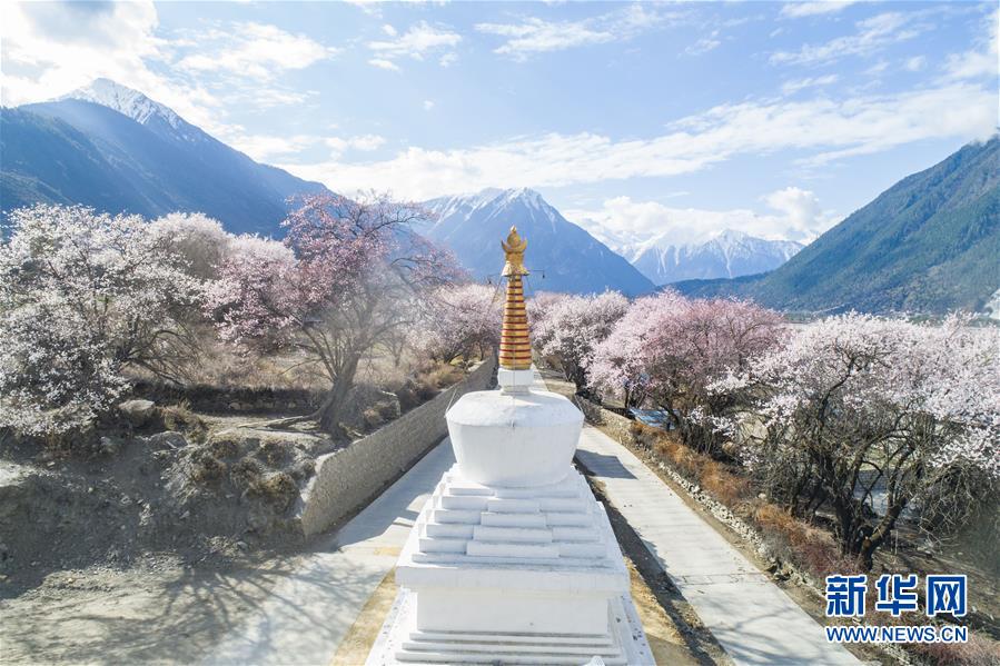 西藏林芝市波密縣境內(nèi)桃花盛開的田園風(fēng)光(無人機照片,3月26日攝)。新華社記者 普布扎西 攝