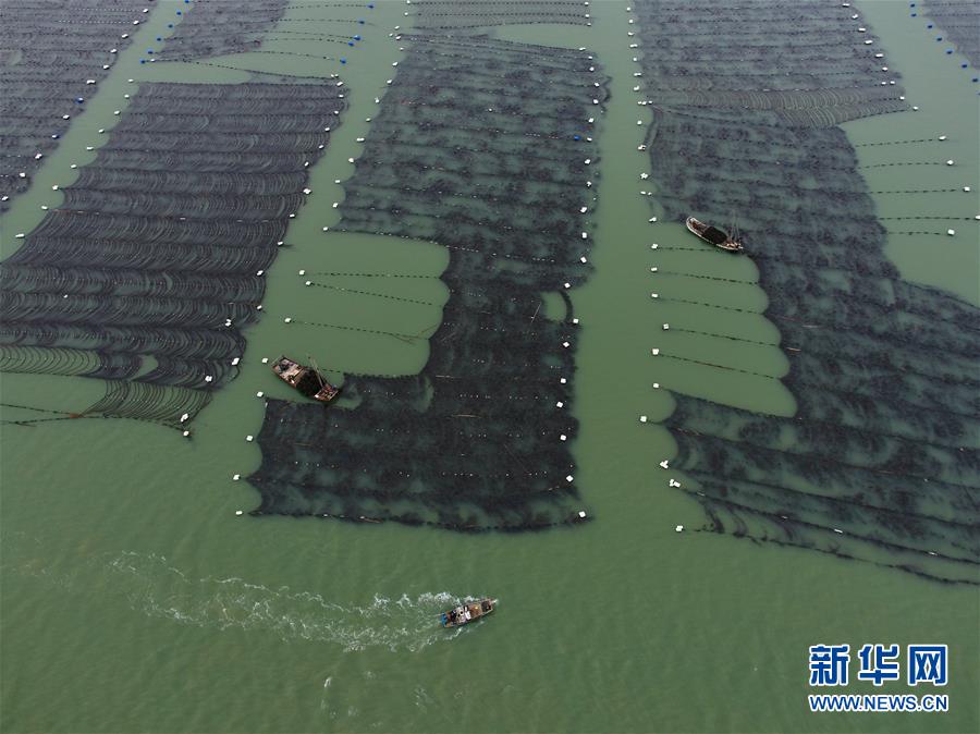 4月10日,霞浦縣長春鎮(zhèn)海域,海帶養(yǎng)殖戶在用船只收獲海帶(無人機拍攝)。新華社記者姜克紅攝