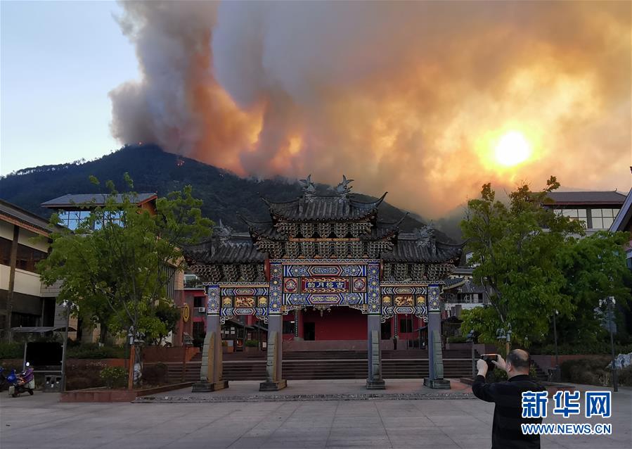 這是3月31日在四川省西昌市邛海畔拍攝的瀘山火場(chǎng)畫面。新華社記者惠小勇攝