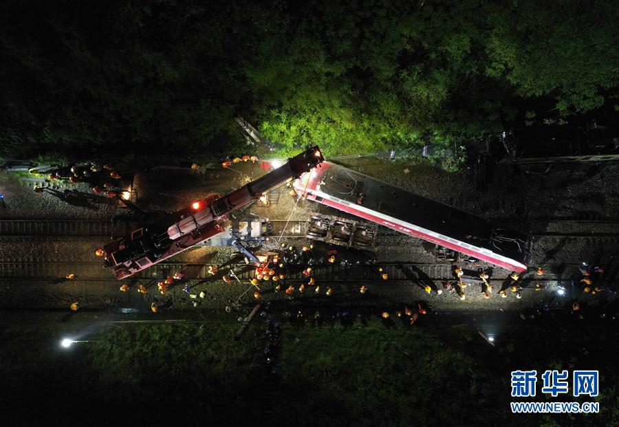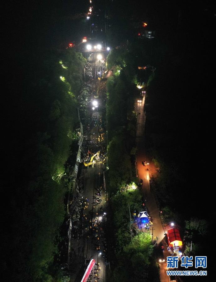 3月30日晚,工程機(jī)械在京廣鐵路郴州段脫軌事故現(xiàn)場(chǎng)作業(yè)(無(wú)人機(jī)照片)。新華社記者李尕?cái)z