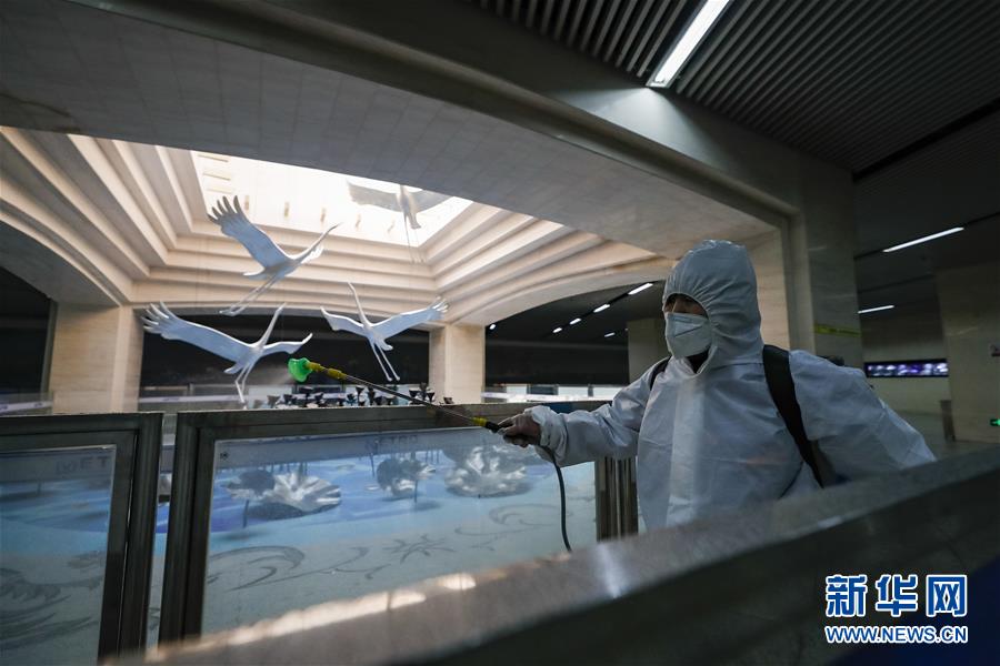 3月23日,在漢口火車站地鐵站,保潔人員在為站廳消毒。新華社記者沈伯韓攝