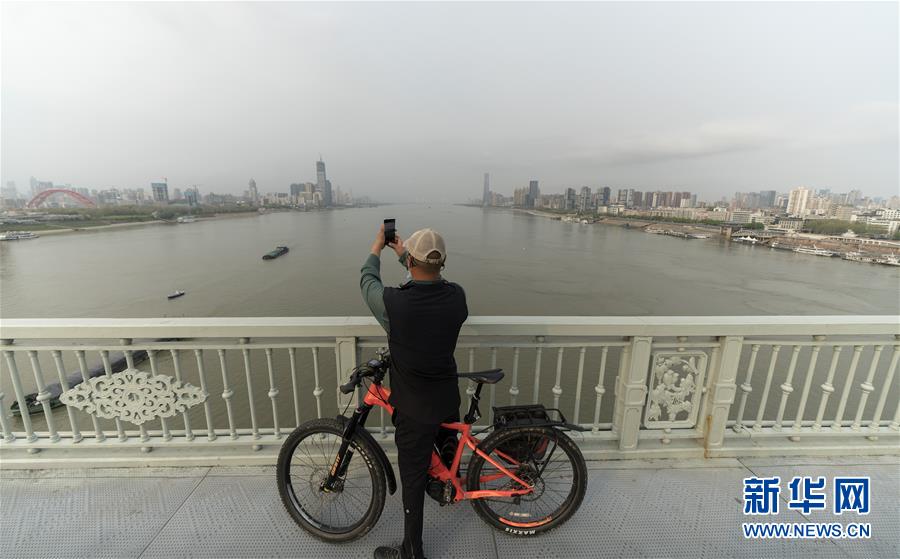 3月25日,在武漢長江大橋,一名騎行的市民停下來拍照。新華社記者費茂華攝