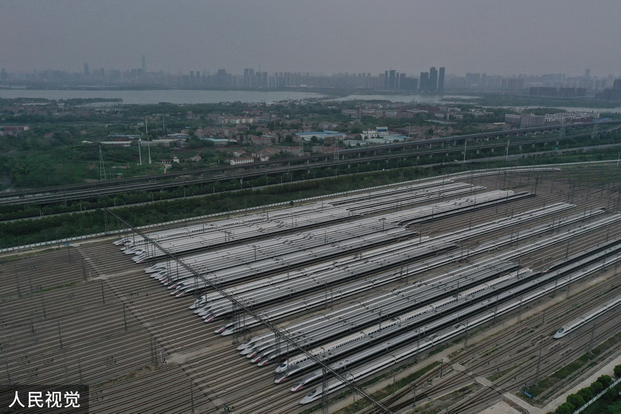 2020年4月6日,武漢動車段高鐵動車組整裝待發(fā)(無人機(jī)照片)。