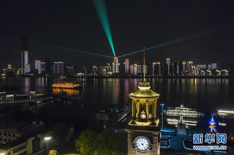 這是4月7日晚拍攝的武漢市江漢關(guān)博物館及長(zhǎng)江對(duì)岸建筑燈光夜景(無(wú)人機(jī)拍攝)。新華社記者沈伯韓攝