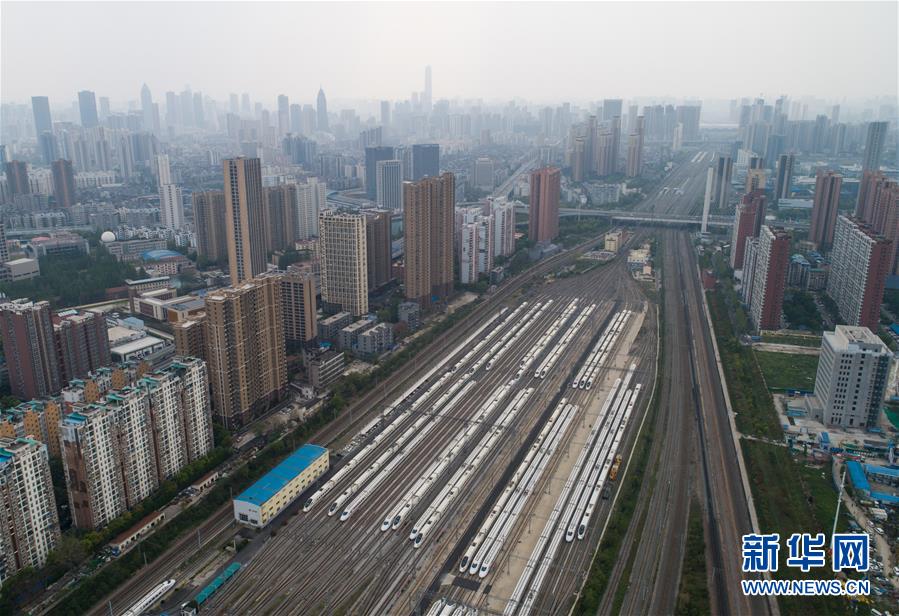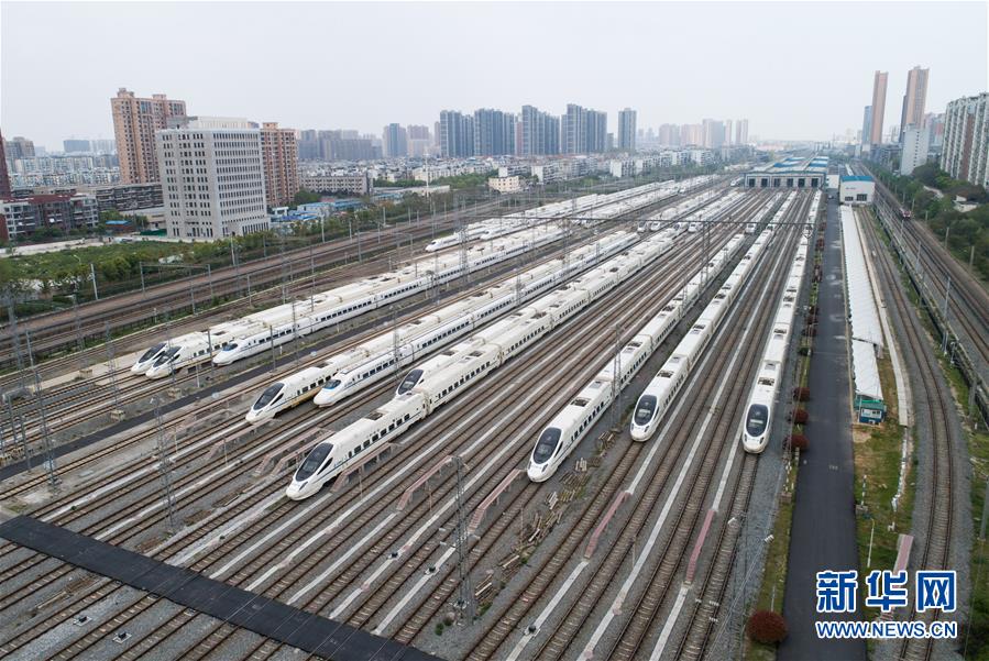 4月7日,在武漢動(dòng)車段,列車停靠在存車線上(無(wú)人機(jī)照片)。 新華社記者 肖藝九 攝