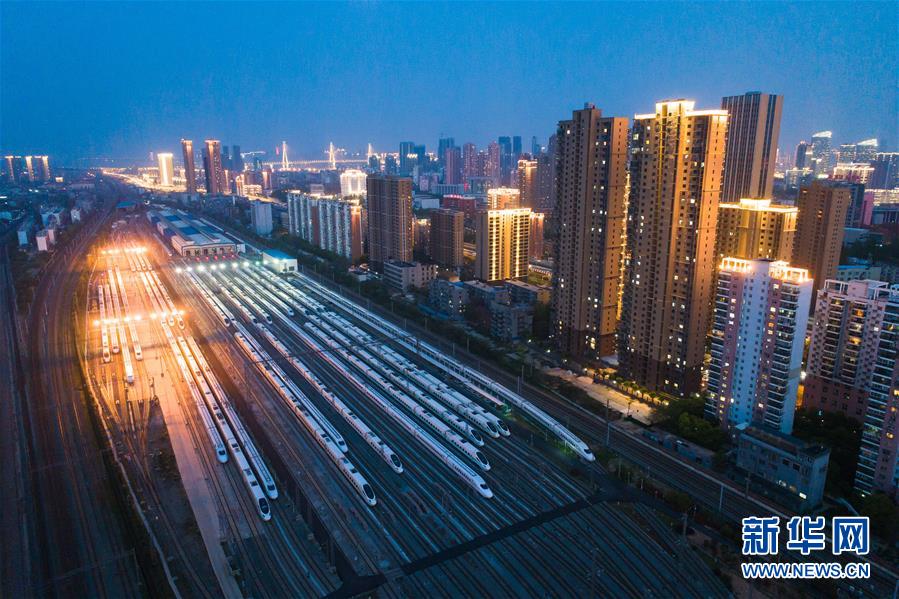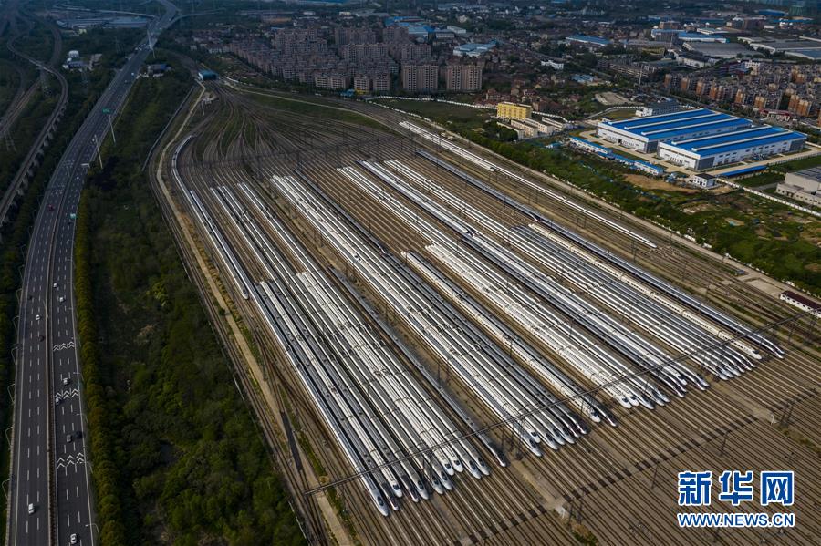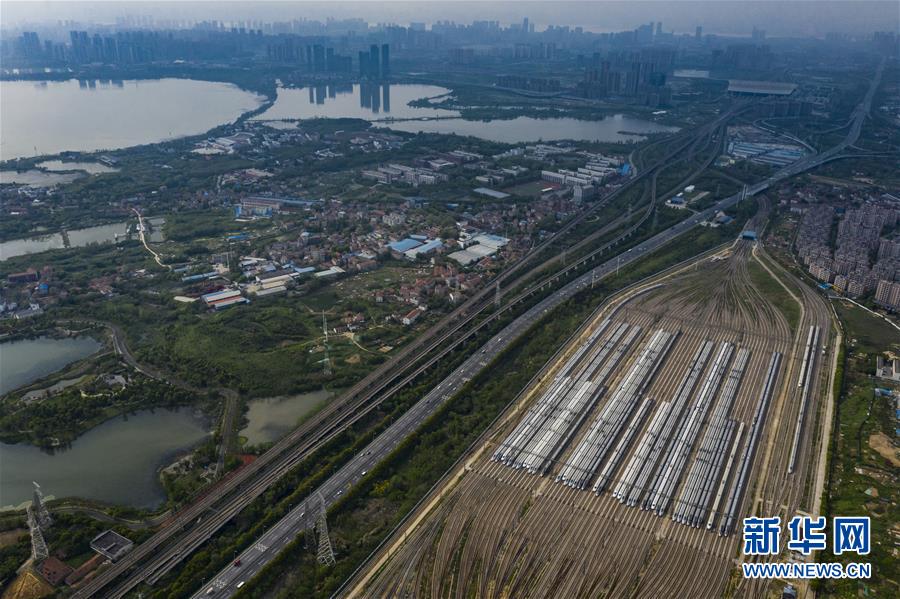4月7日,在武漢動(dòng)車段,列車停靠在存車線上(無(wú)人機(jī)照片)。新華社記者 沈伯韓 攝