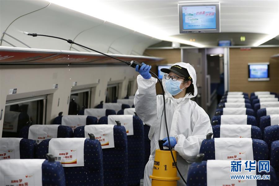 4月7日,武漢動(dòng)車段運(yùn)用車間工作人員周明輝在給列車消毒。新華社記者 沈伯韓 攝