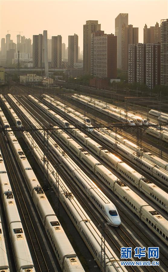 4月7日,在武漢動(dòng)車段,列車??吭诖孳嚲€上(無(wú)人機(jī)照片)。