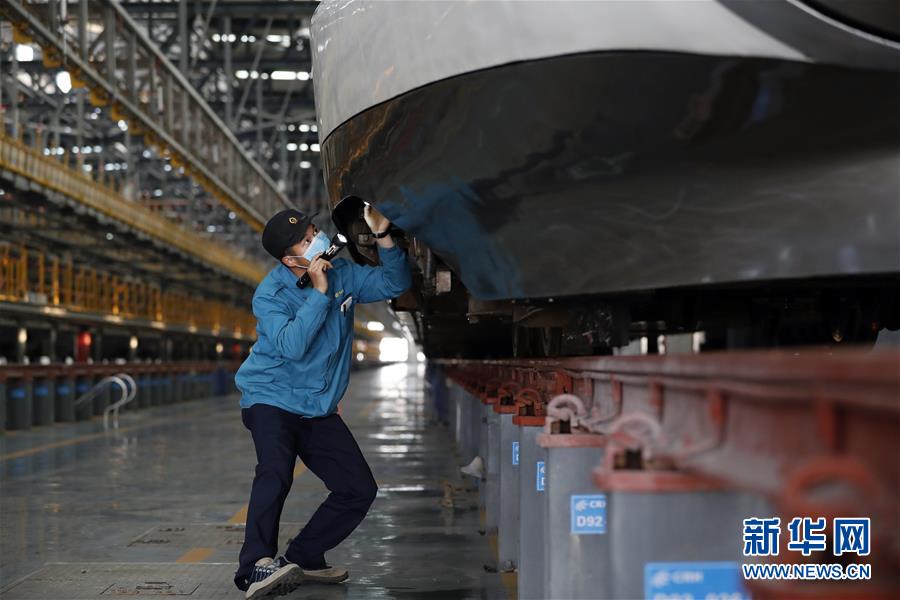4月7日,武漢動(dòng)車段運(yùn)用車間綜合檢修班工長(zhǎng)楊磊在檢查車輛情況。 新華社記者 沈伯韓 攝