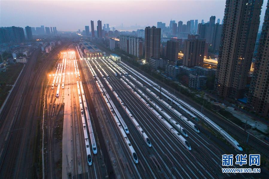 4月8日,在武漢動車段,列車停靠在存車線上準備投入運行(無人機照片)。 新華社記者 肖藝九 攝
