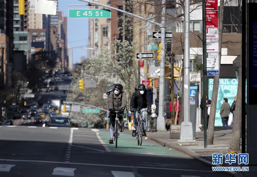 3月21日,在美國紐約第二大道,人們戴口罩騎車出行。新華社記者王迎攝