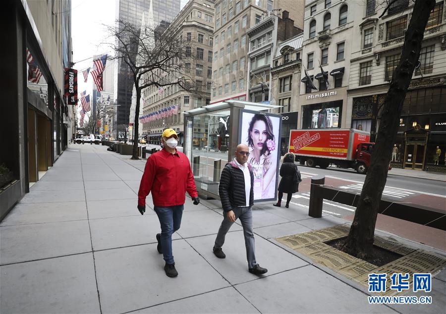 3月19日,在美國紐約曼哈頓,行人走在空曠的第五大道上。新華社記者王迎攝
