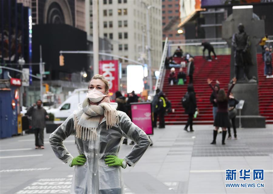 3月19日,一名戴口罩的女子在美國紐約曼哈頓時報廣場拍照。新華社記者王迎攝