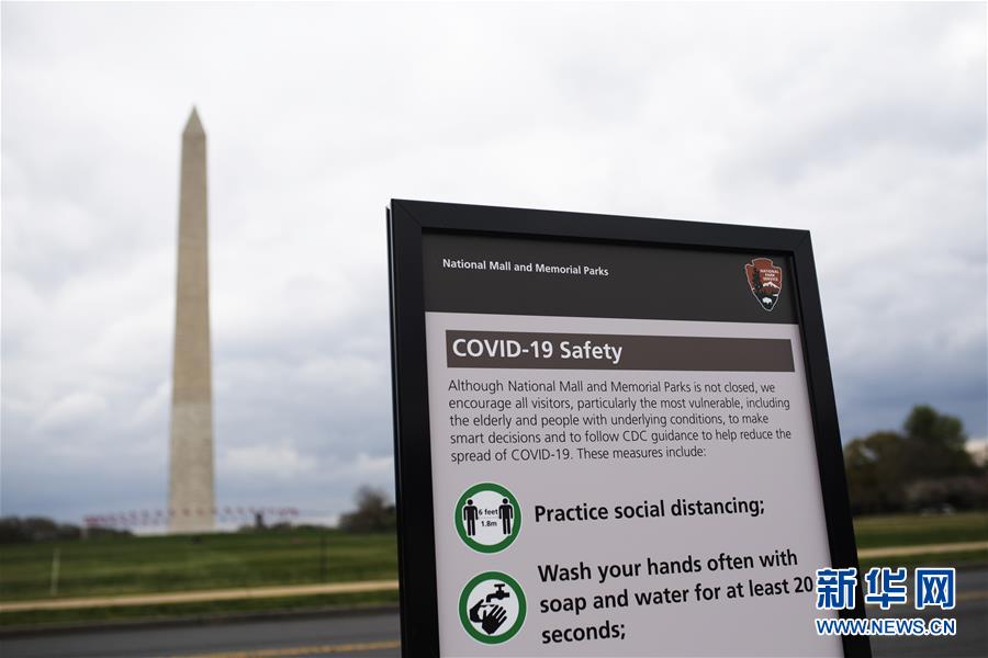 這是4月1日在美國(guó)華盛頓紀(jì)念碑附近拍攝的新冠肺炎疫情防控提示牌。新華社記者劉杰攝
