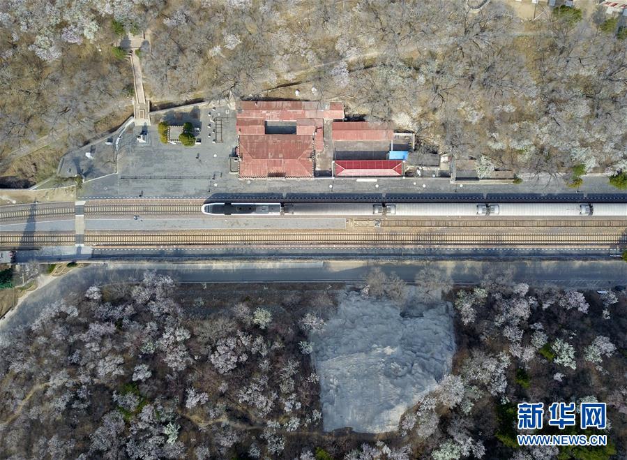 4月8日,北京青龍橋火車站附近春花盛開(無人機照片)。  新華社記者張晨霖攝
