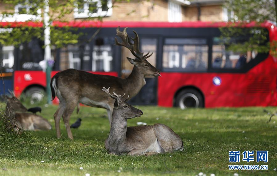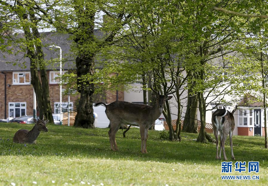 4月8日,在英國倫敦東部一個(gè)居民區(qū),附近公園里的鹿在草坪上駐足。隨著新冠疫情在英國的擴(kuò)散,政府要求人們減少不必要的外出。倫敦東部一個(gè)居民區(qū)附近公園里原來散養(yǎng)的鹿紛紛從公園走出來,或吃草或接受附近居民的喂食,成為特殊時(shí)期居民區(qū)里的新“客人”。新華社記者韓巖攝