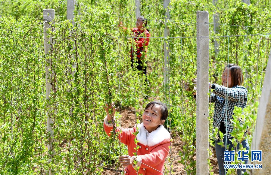4月13日,洛南縣麻坪鎮(zhèn)三興村12組的村民在中藥材種植專業(yè)合作社五味子種植基地忙碌。新華社記者陶明攝