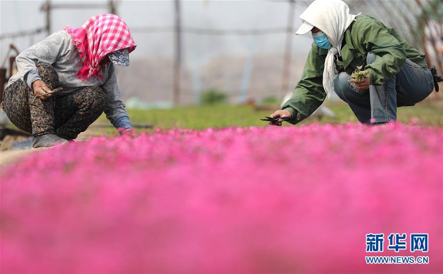 4月13日,在八角臺街道雅化村花圃內(nèi),花農(nóng)為宿根花卉除草。新華社記者姚劍鋒攝