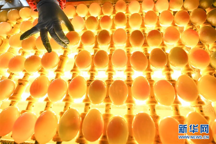江蘇高郵鴨集團(tuán)的工作人員在生產(chǎn)線上對鴨蛋進(jìn)行光檢作業(yè)(4月15日攝)?!案哙]鴨蛋”是江蘇高郵的特色農(nóng)業(yè)名片。近年來,當(dāng)?shù)卦诹挤N繁育、生態(tài)養(yǎng)殖、產(chǎn)品加工等方面加大力度,推動高郵鴨蛋品牌化建設(shè),讓小鴨蛋成為帶動農(nóng)戶致富的大產(chǎn)業(yè)。2019年,高郵市共計生產(chǎn)熟制鴨蛋產(chǎn)品近11.2億枚,年產(chǎn)值近17.68億元。新華社記者李博攝