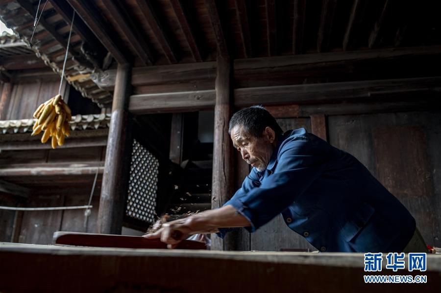 73歲的石屏縣異龍鎮(zhèn)符家營(yíng)村村民楊國(guó)保在家中制作村里修整老屋所需的木梁(8月8日攝)。新華社記者江文耀攝