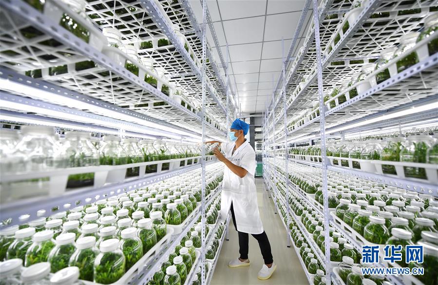 4月21日,在位于施茶村的海南勝嶸生物科技有限公司石斛育種培養(yǎng)室內(nèi),工作人員在進(jìn)行石斛育種。新華社記者郭程攝